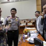 Waka Polri Komjen Polisi Ari Dono Sukmanto (kedua dari kiri) berbicang dengan Ketua Komisi III DPR dari Fraksi Golkar Kahar Muzakir (kedua dari kanan) Wakil Ketua Komisi III dari Farksi Demokrat Erma Suryani Ranik (kanan), anggota Komisi III Fraksi Nasdem Taufiqulhadi (tengah) dan anggota Komisi III Fraksi Hanura Syarifuddin Suding (kiri) bertegur sapa usai mengikuti Rapat Dengar Pendapat (RDP) di Gedung Nusantara III, Kompleks Parlemen Senayan, Jakarta, Kamis (6/9). Rapat tersebut membahas Rencana Kerja Anggaran Kementerian/Lembaga (RKA – KL) Tahun 2019, hasil dari RUU APBN. AKTUAL/Tino Oktaviano