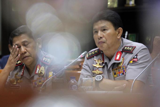 Waka Polri Komjen Polisi Ari Dono Sukmanto (kanan) Kepala Lembaga Pendidikan dan Pelatihan Polri Komjen Polisi Unggung Cahyono (kiri), mengikuti Rapat Dengar Pendapat (RDP) di Gedung Nusantara III, Kompleks Parlemen Senayan, Jakarta, Kamis (6/9). Rapat tersebut membahas Rencana Kerja Anggaran Kementerian/Lembaga (RKA - KL) Tahun 2019, hasil dari RUU APBN. AKTUAL/Tino Oktaviano