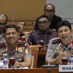 Waka Polri Komjen Polisi Ari Dono Sukmanto (kanan) Kepala Lembaga Pendidikan dan Pelatihan Polri Komjen Polisi Unggung Cahyono (kiri), mengikuti Rapat Dengar Pendapat (RDP) di Gedung Nusantara III, Kompleks Parlemen Senayan, Jakarta, Kamis (6/9). Rapat tersebut membahas Rencana Kerja Anggaran Kementerian/Lembaga (RKA – KL) Tahun 2019, hasil dari RUU APBN. AKTUAL/Tino Oktaviano